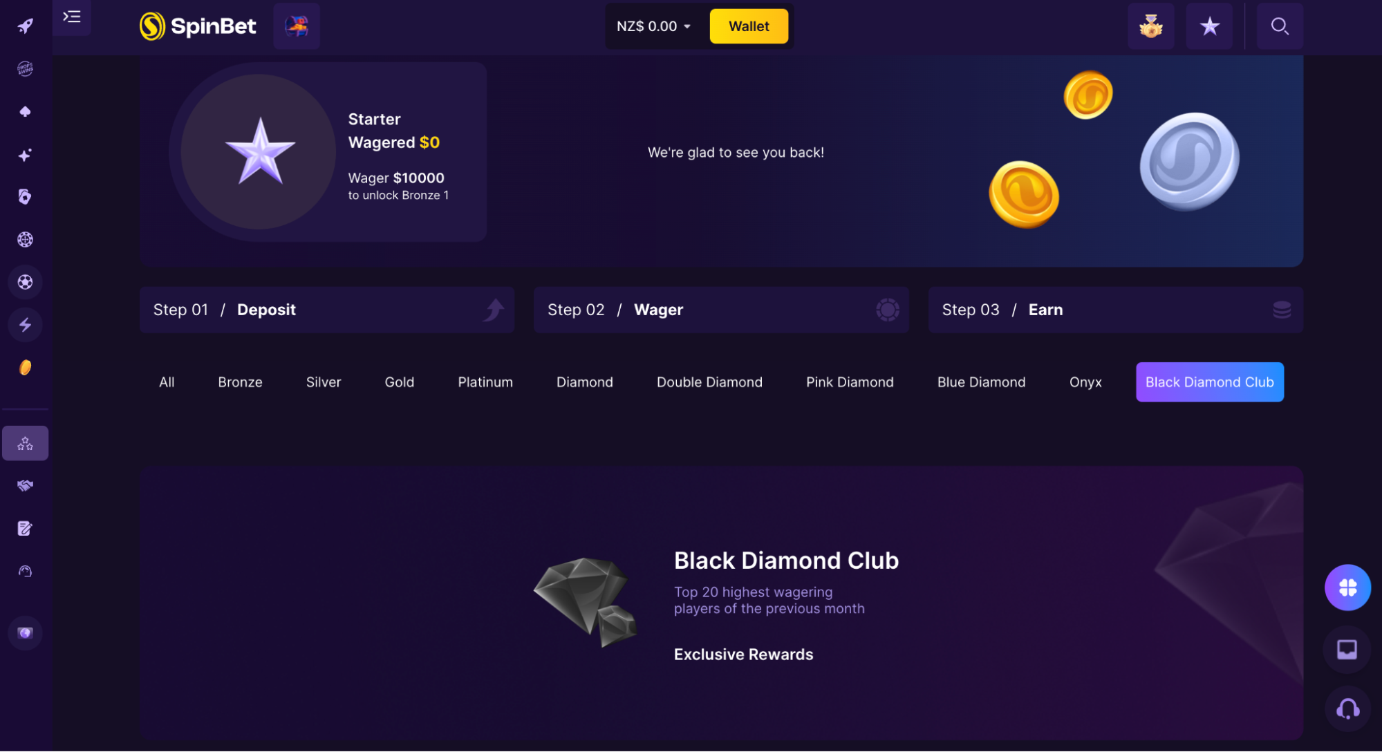 Spinbet NZ's VIP program is a highlight, rewarding committed players with special perks. The program has levels from Bronze to the top Black Diamond Club. Players earn points as they bet, moving up the VIP ladder. Increased-tier members get tailored perks, such as cashback, increased withdrawal limits, and unique promos. Top VIPs can also get a bespoke gaming experience from dedicated account managers.
